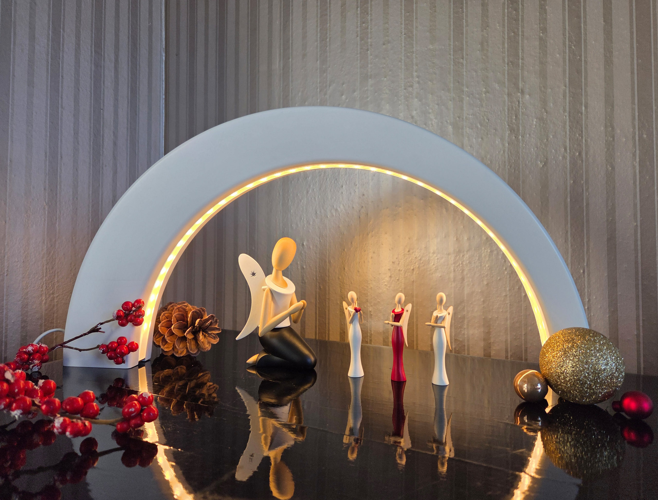Der LED Lichterbogen SIMPLEX von Näumanns ist wie eine leise Lichtbühne für deine Engel. Die klare, moderne Form hält sich bewusst im Hintergrund, während das warme LED-Licht deine Figuren sanft einrahmt. Ob Minis, kniende oder größere Engel – unter diesem Bogen rücken sie zu einer stimmigen kleinen Szene zusammen und bekommen einen gemeinsamen Mittelpunkt in deinem Zuhause.