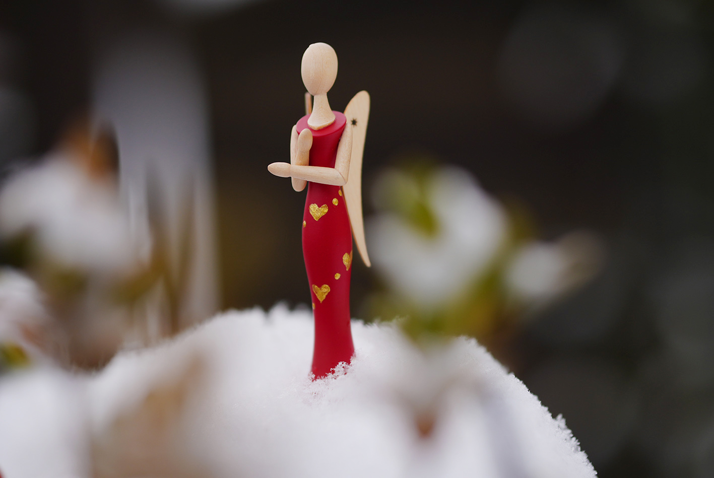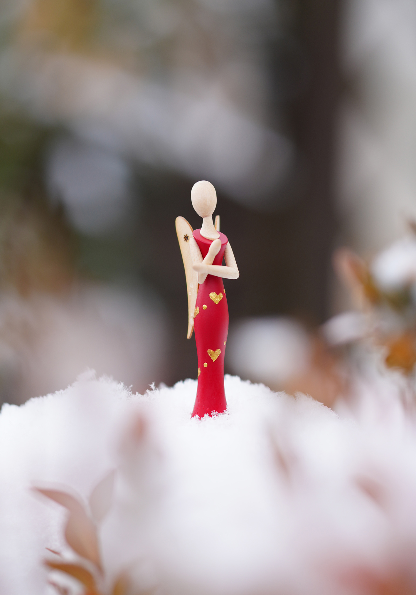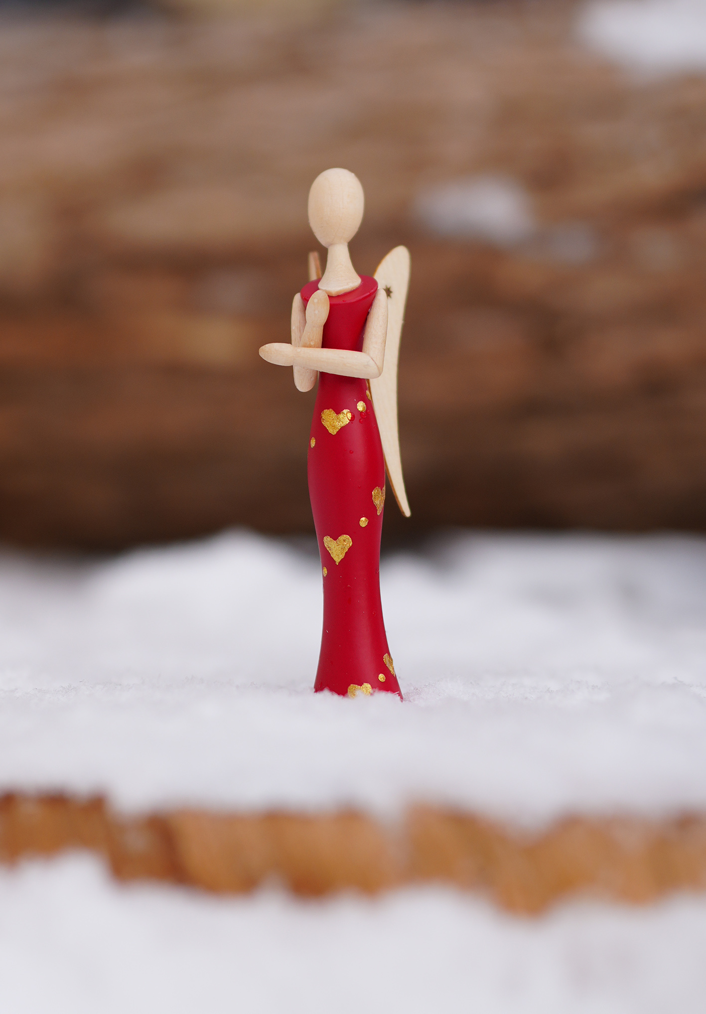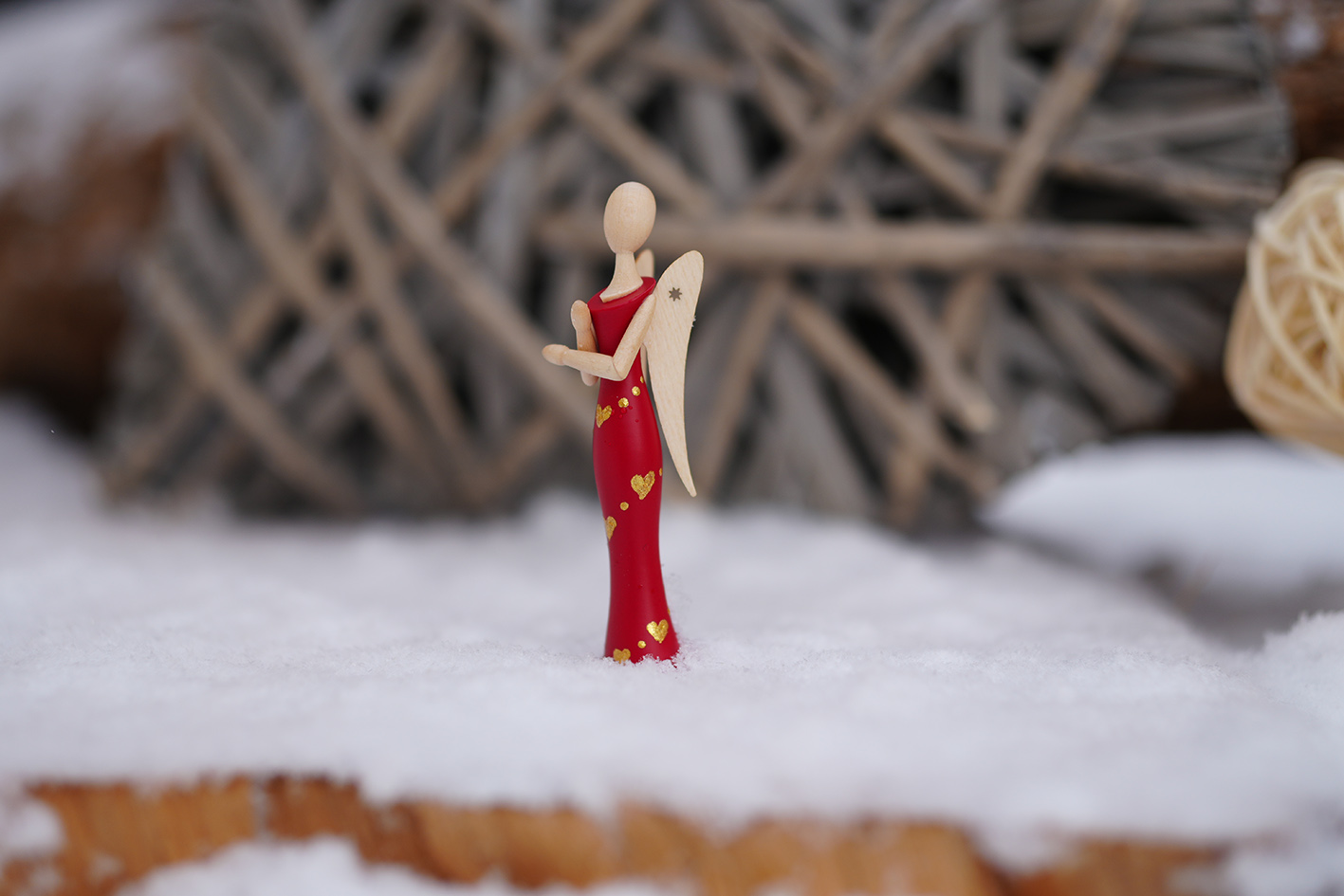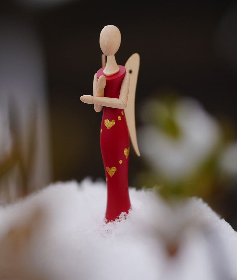 Herz für Herz … Auf dem tiefroten Kleid des Mini-STERNKOPF-ENGELS schimmern feine, goldene Herzen. Sie fangen das Licht ein wie kleine Liebesfunken und machen aus dem Engel einen stillen Boten für Zuneigung, Verbundenheit und all die Gefühle, die zwischen den Zeilen liegen.